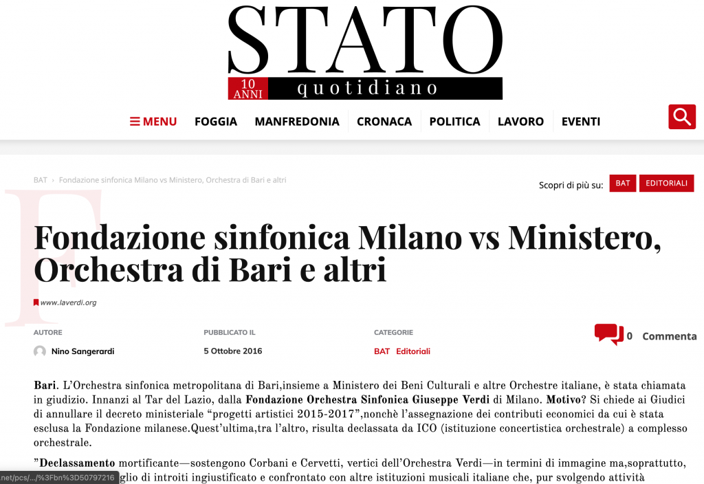Diritto dei beni culturali e dello spettacolo “Fondazione sinfonica Milano vs Ministero, Orchestra di Bari e altri “ – Statoquotidiano.it, ottobre 2016StaffGennaio 31, 2022