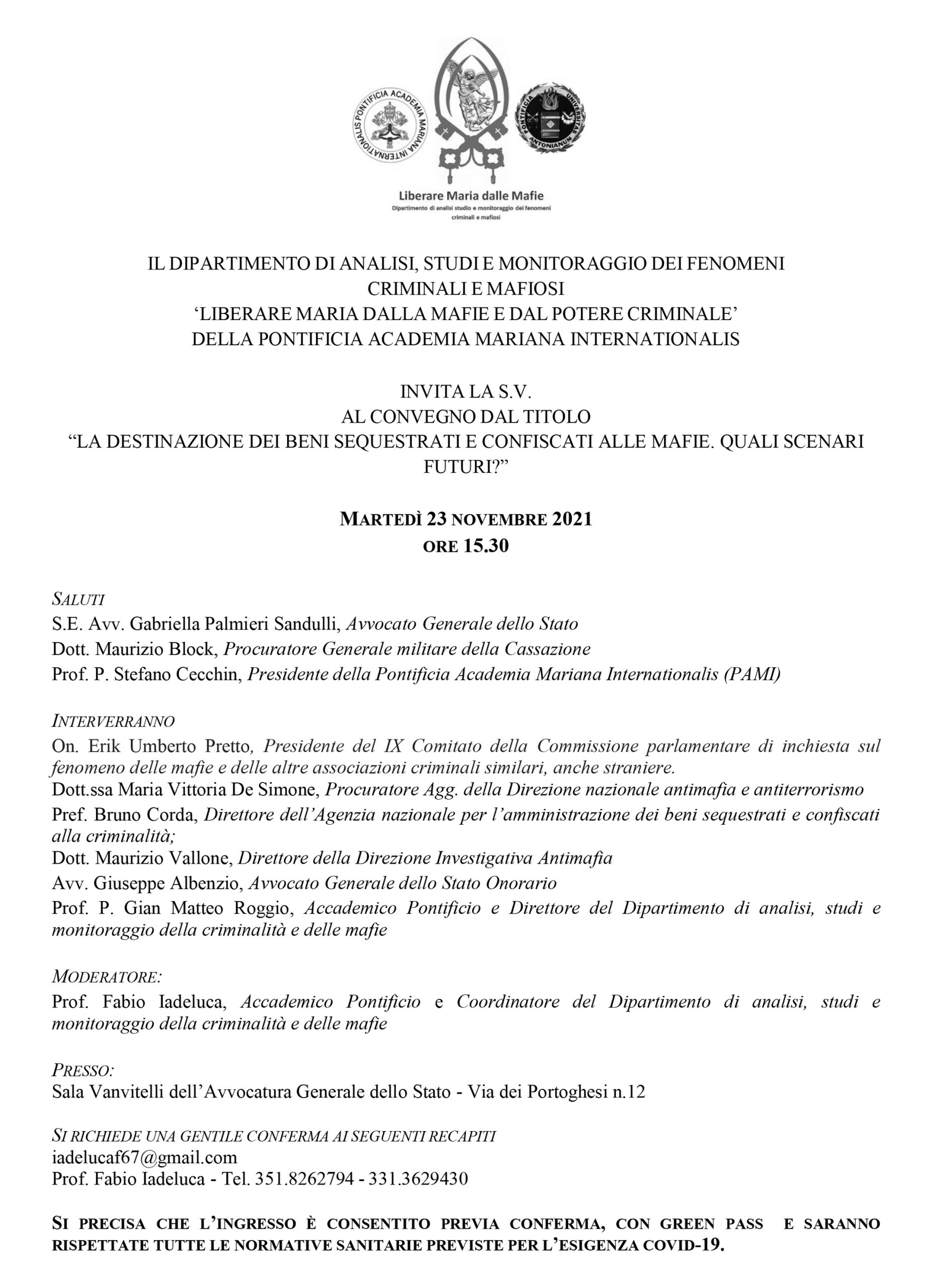 Convegno Pontificia Academia 2021 su “Destinazione dei beni confiscati alle mafie”