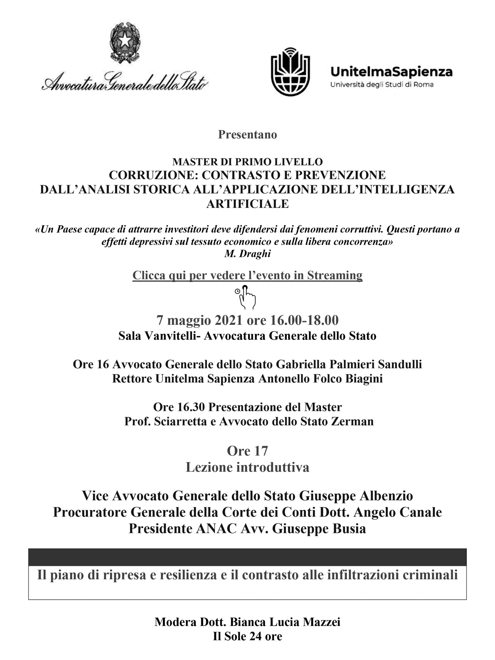“Corruzione: contrasto e prevenzione dall’analisi storica all’applicazione dell’intelligenza artificiale” – Convegno Avvocatura Generale dello Stato, Maggio 2021