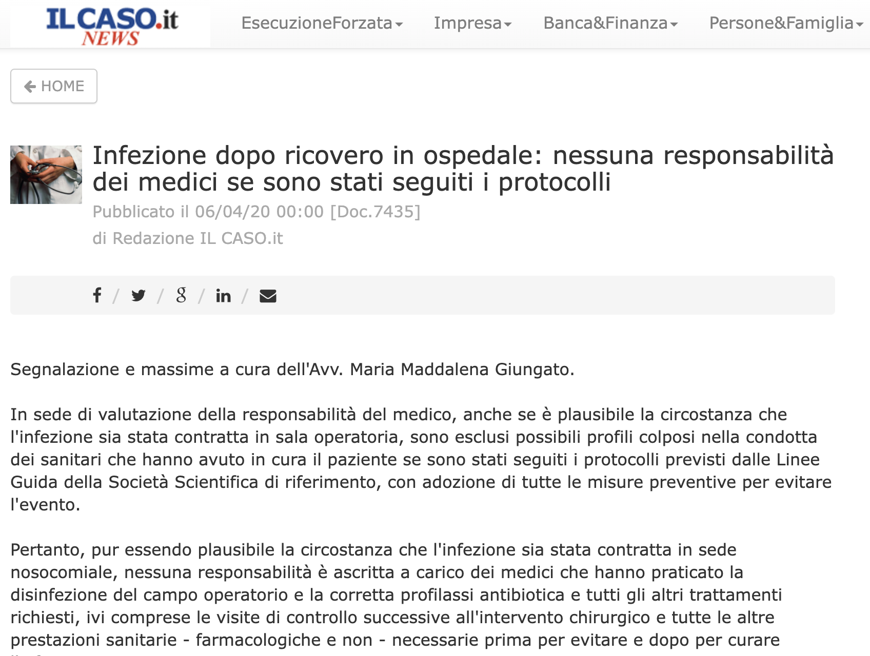 “Infezione dopo ricovero in ospedale: nessuna responsabilità dei medici se sono stati seguiti i protocolli” – ilcaso.it, Aprile 2020